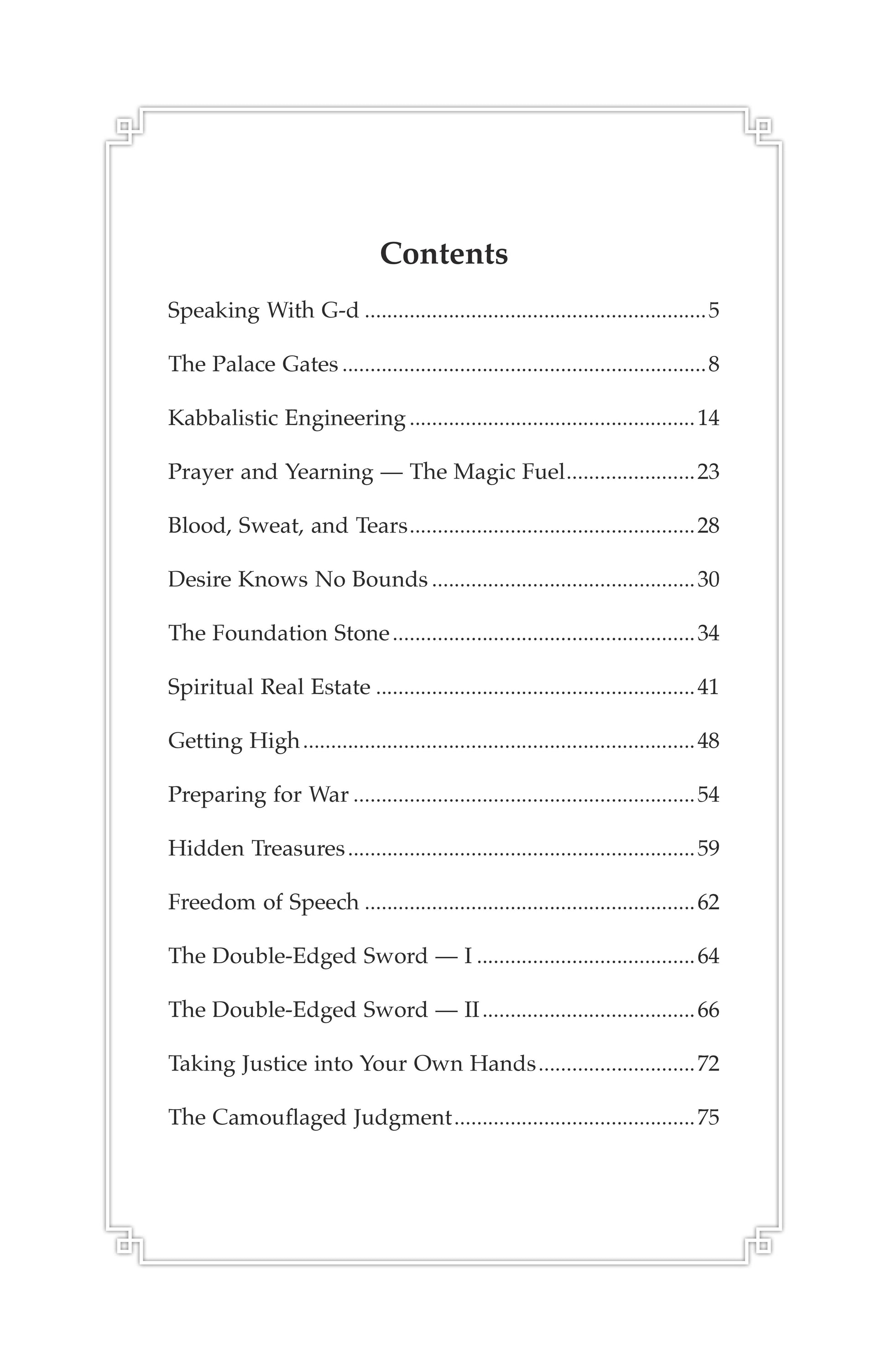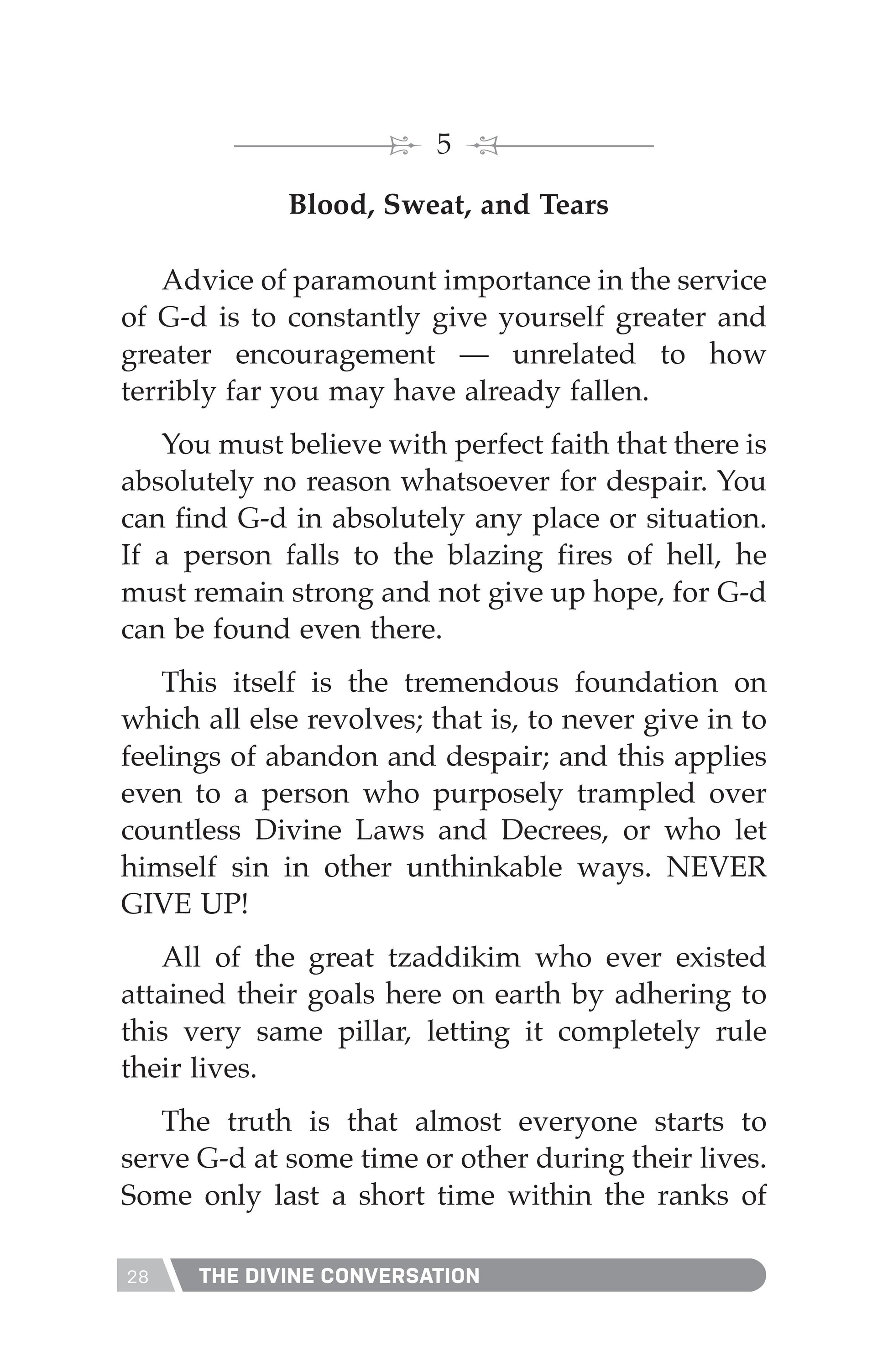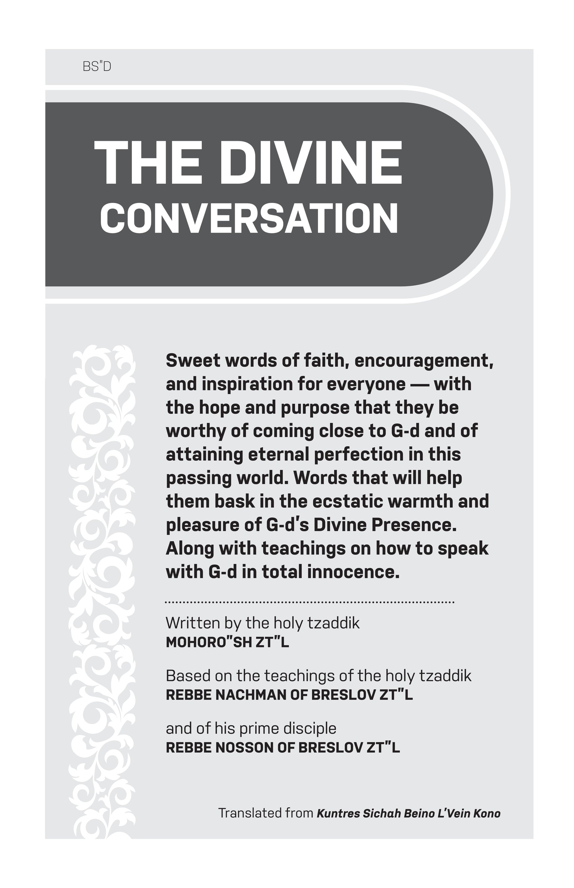 Sweet words of faith, encouragement, and inspiration for everyone — with the hope and purpose that they be worthy of coming close to G-d and of attaining eternal perfection in this passing world. Words that will help them bask in the ecstatic warmth and pleasure of G-d’s Divine Presence. Along with teachings on how to speak with G-d in total innocence.