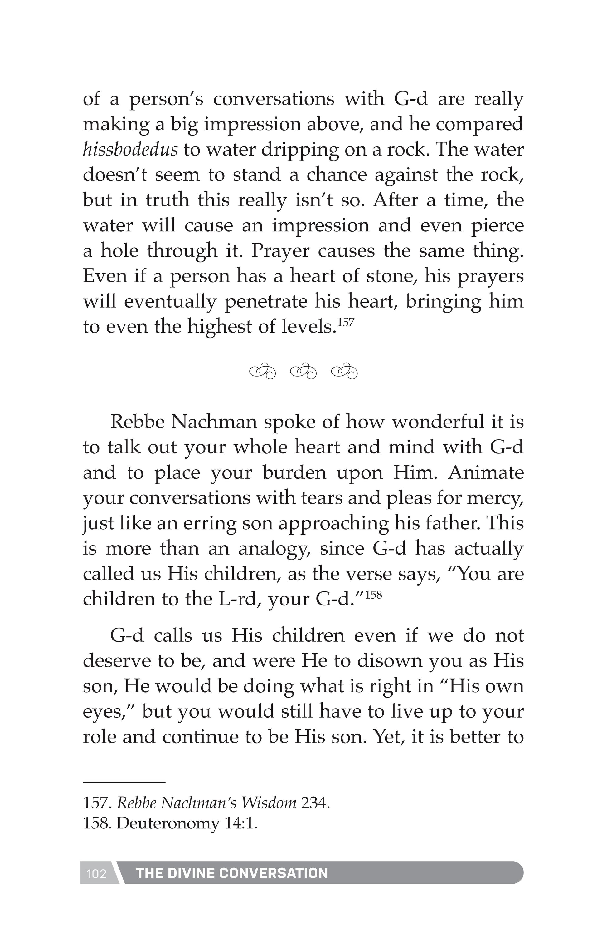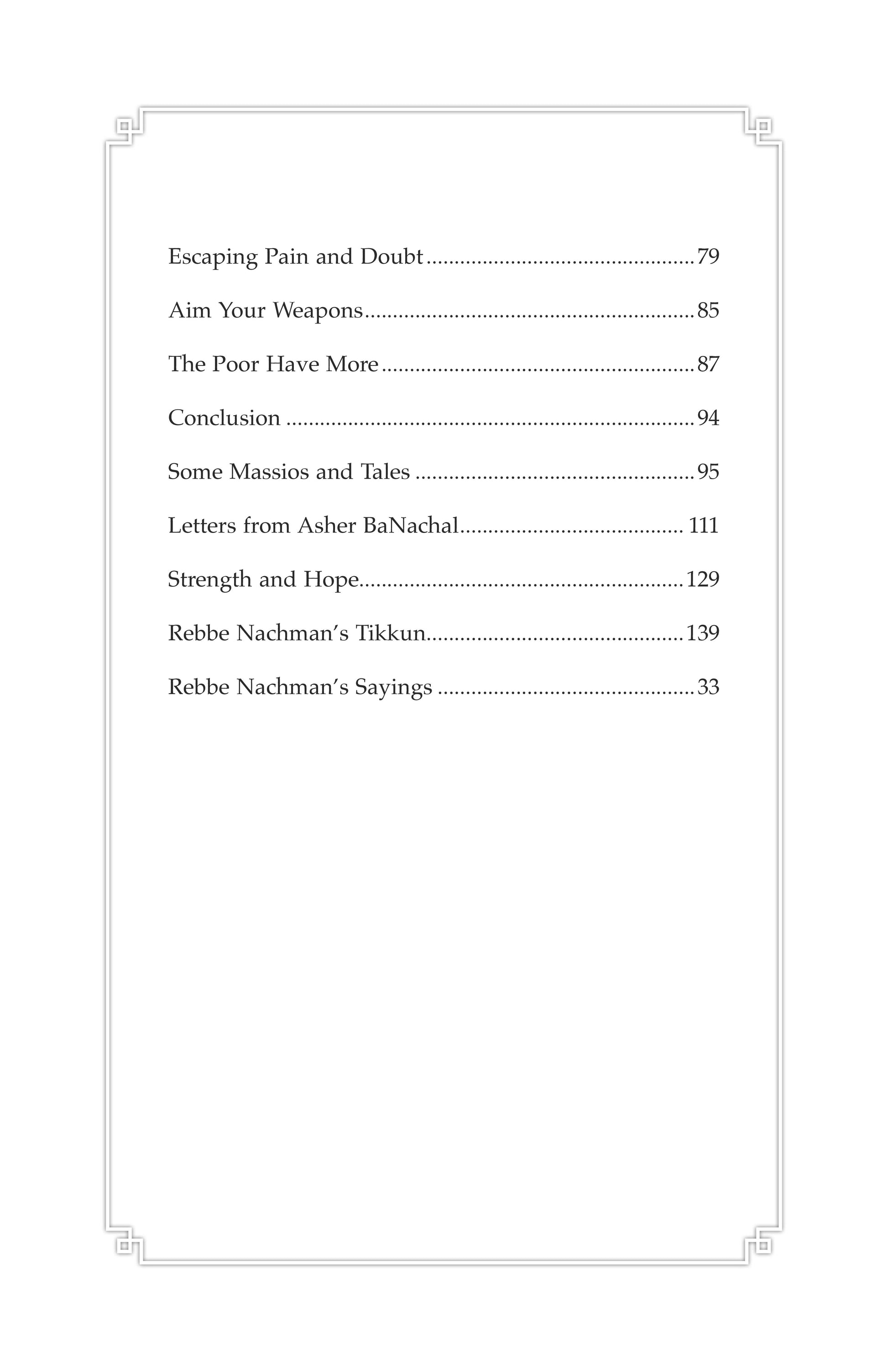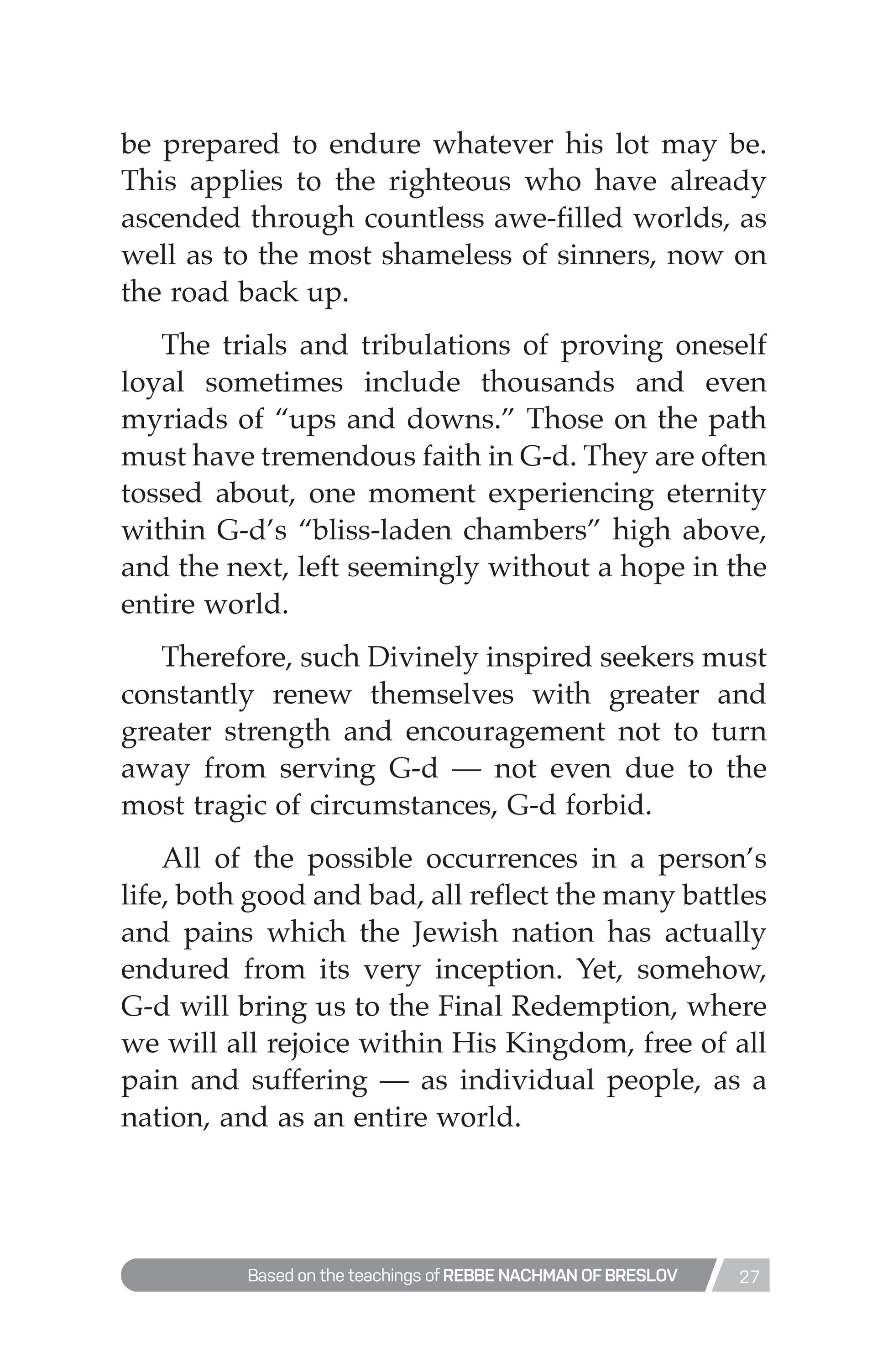Sweet words of faith, encouragement, and inspiration for everyone — with the hope and purpose that they be worthy of coming close to G-d and of attaining eternal perfection in this passing world. Words that will help them bask in the ecstatic warmth and pleasure of G-d’s Divine Presence. Along with teachings on how to speak with G-d in total innocence.